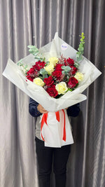 يُضفي تباين اللونين الأحمر والأبيض توازنًا بصريًا خلابًا يُعبّر عن روعة كل وردة. تُربط كل وردة يدويًا على يد منسقي زهور محترفين، وتُختار بعناية فائقة لنضارتها وجمالها الأخّاذ.